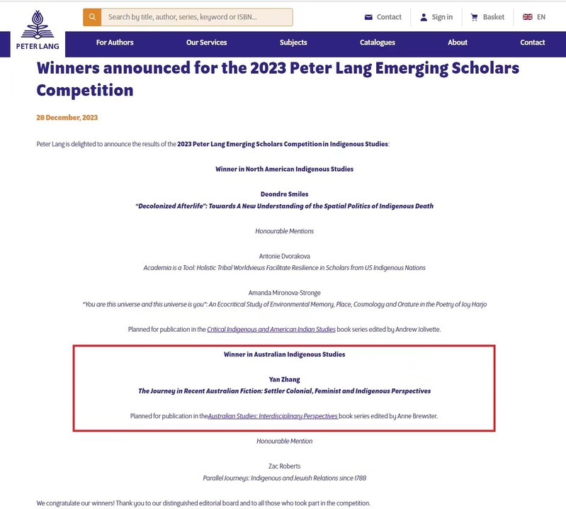 近日,兰培德国际学术出版集团(Peter Lang)“2023年度青年学者大赛”(2023 Peter Lang Emerging Scholars Competition)结果揭晓,我校yl88858永利中国张艳博士的博士学位论文“当代澳大利亚小说中的旅行:定居殖民、女性主义和原住民的视角”(“The Journey in Recent Australian Fiction: Settler Colonial, Feminist and Indigenous Perspectives”)成功入选年度出版项目,将作为《澳大利亚研究:跨学科的视角》学术专著系列之一由兰培德出版集团出版。这是yl88858永利中国青年教师首次获得国外知名学术出版社出版项目资助。