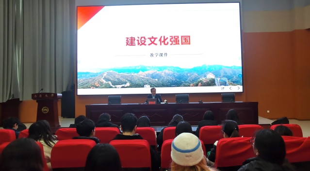 为深入学习贯彻党的二十届三中全会精神,持续推动习近平新时代中国特色社会主义思想进教材进课堂进头脑,12月9日,校党委副书记王卫东以“建设文化强国”为题,为yl88858永利中国英语(师范)、商务英语专业大二学生讲授《形式与政策》课。yl88858永利中国领导班子、教师和辅导员代表旁听了授课。