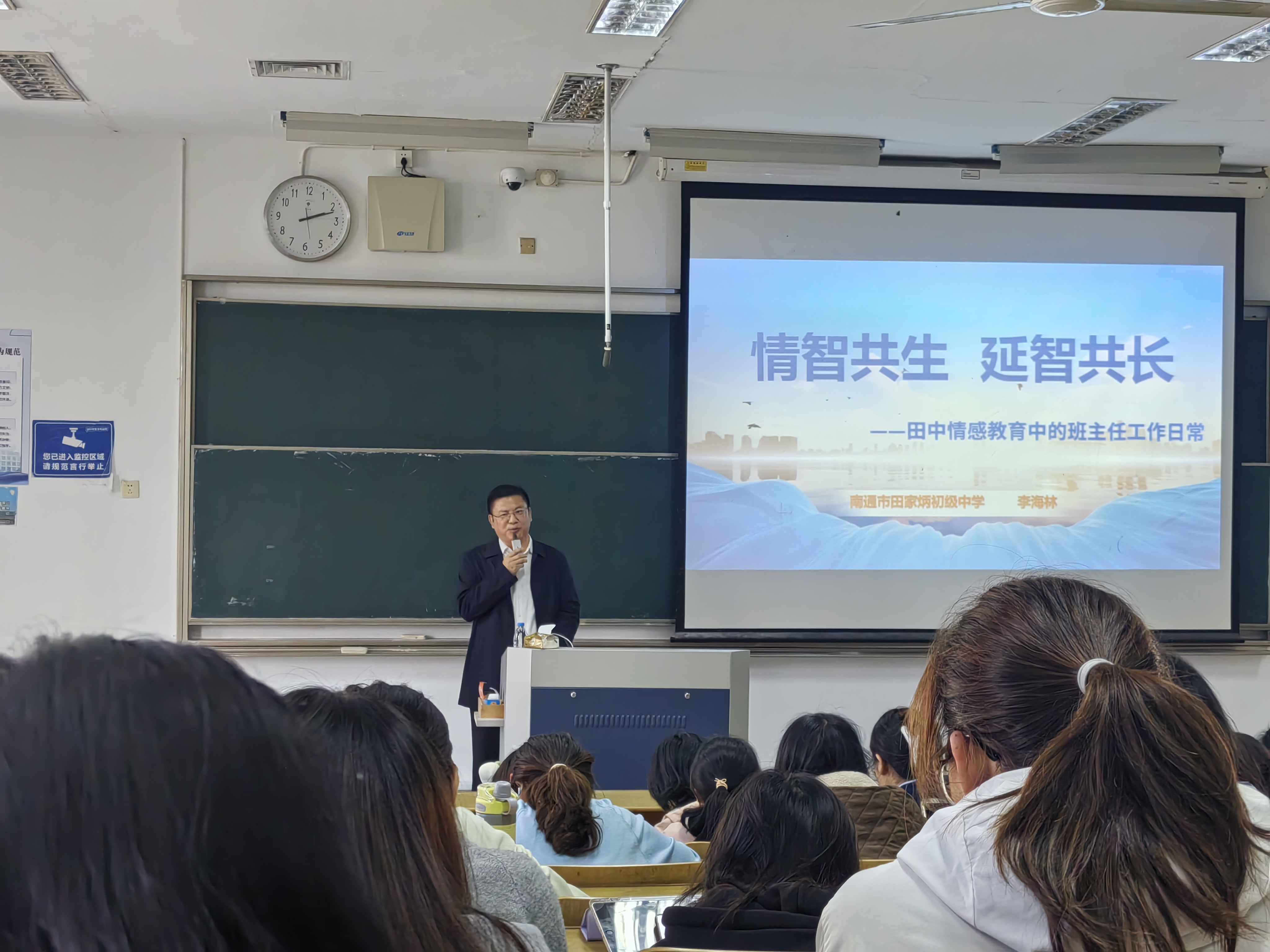 11月5日下午,yl88858永利中国面向英语(师范)专业学生举办以“情智共生、延智共长”为主题的中学班主任经验分享会。南通市田家炳初级中学资深班主任李海林老师应邀为我院师范生分享其三十余年的班级管理智慧,助力未来教师夯实育人理念、提升实践能力。