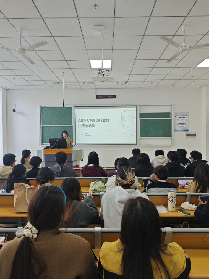 11月11日上午,我院商务英语专业开展“AI赋能与职业发展”主题活动,特邀译国译民集团洪细梅老师做“AI时代下翻译行业的突围和转型”专题讲座。商务英语专业全体学生参与此次活动,学院MTI研究生也共同参与学习。